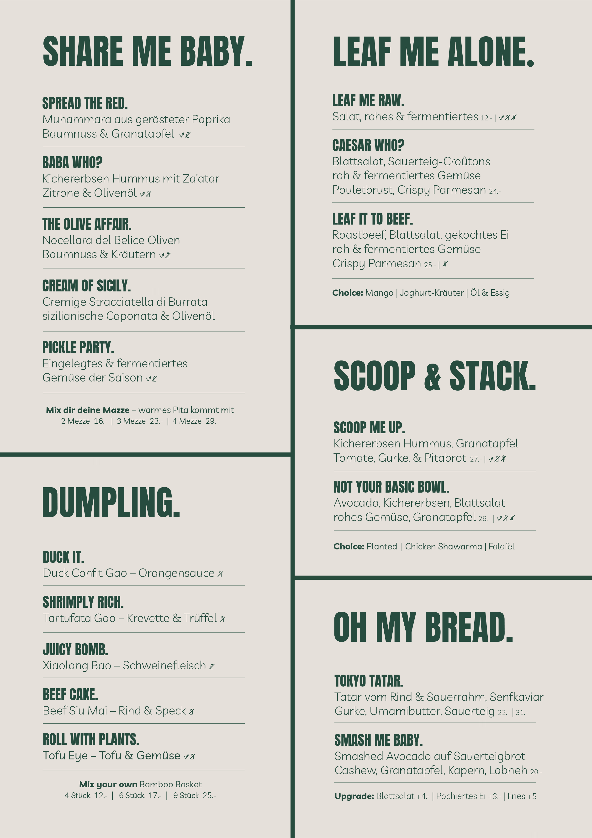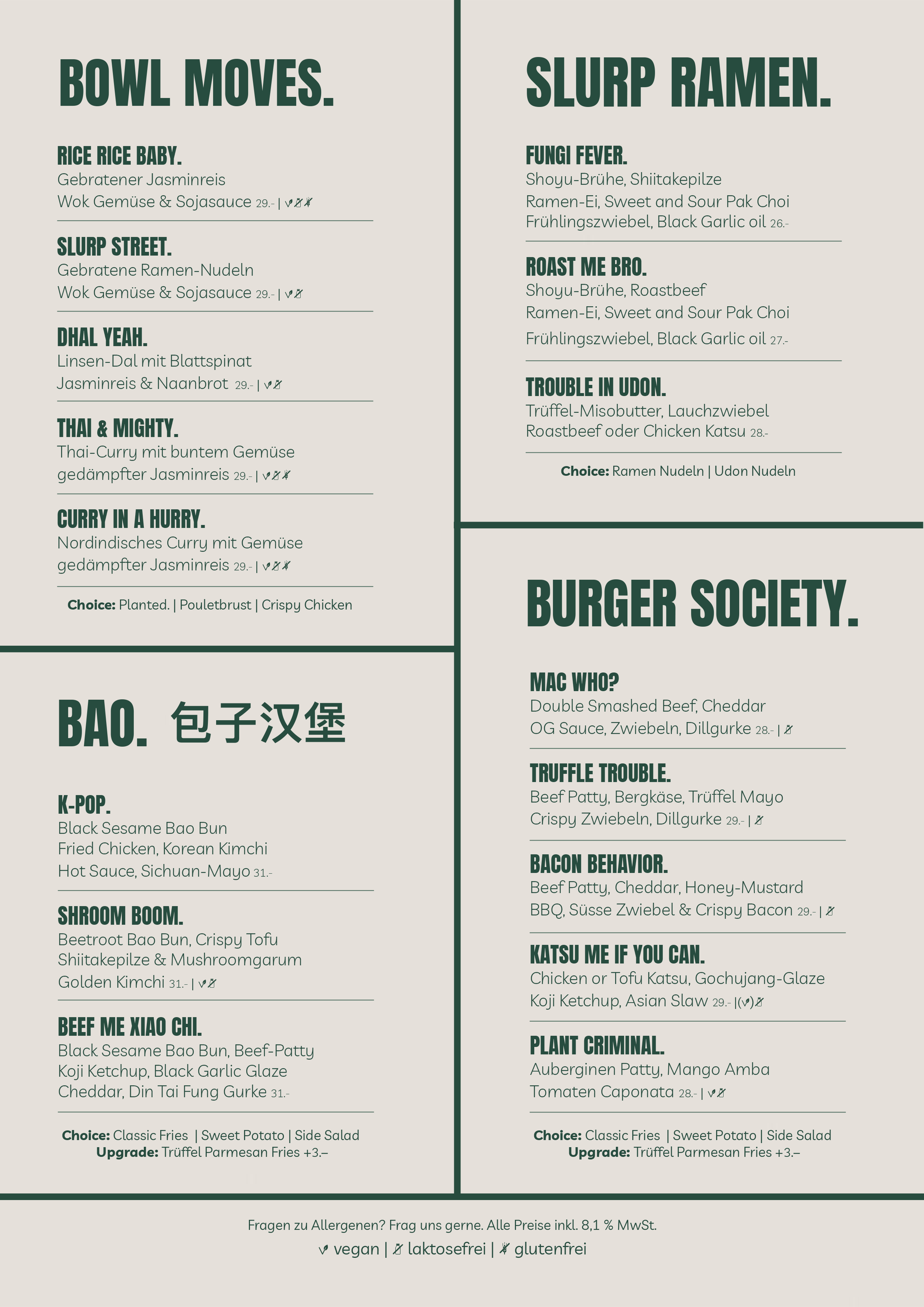 Bowls, Baos, Burger & mehr – laut, heiss und richtig gut. Alles frisch zubereitet. Alles mit Attitude. Alles für deinen Moment am Tisch.